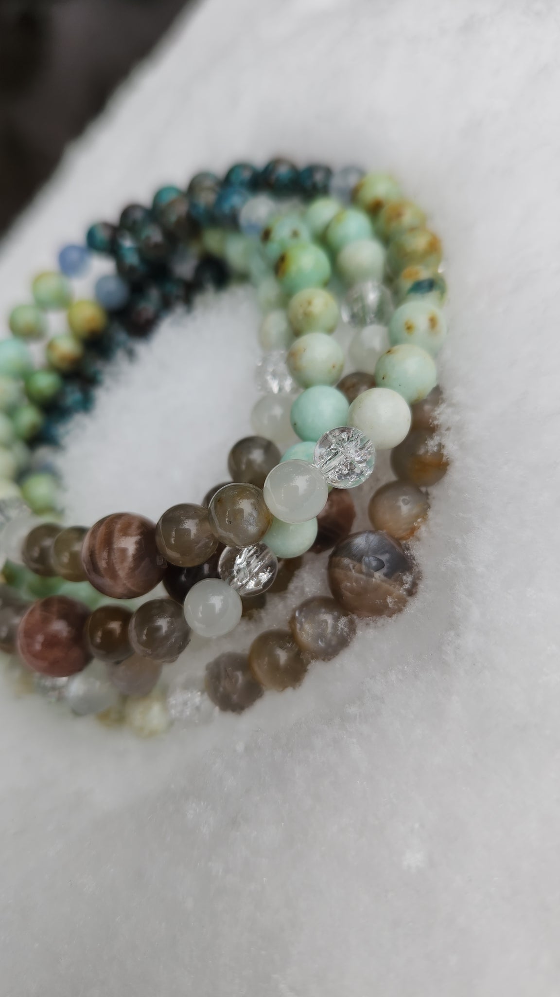 Made with moonstone, quartz, turquoise, kyanite, and Chrysocolla.