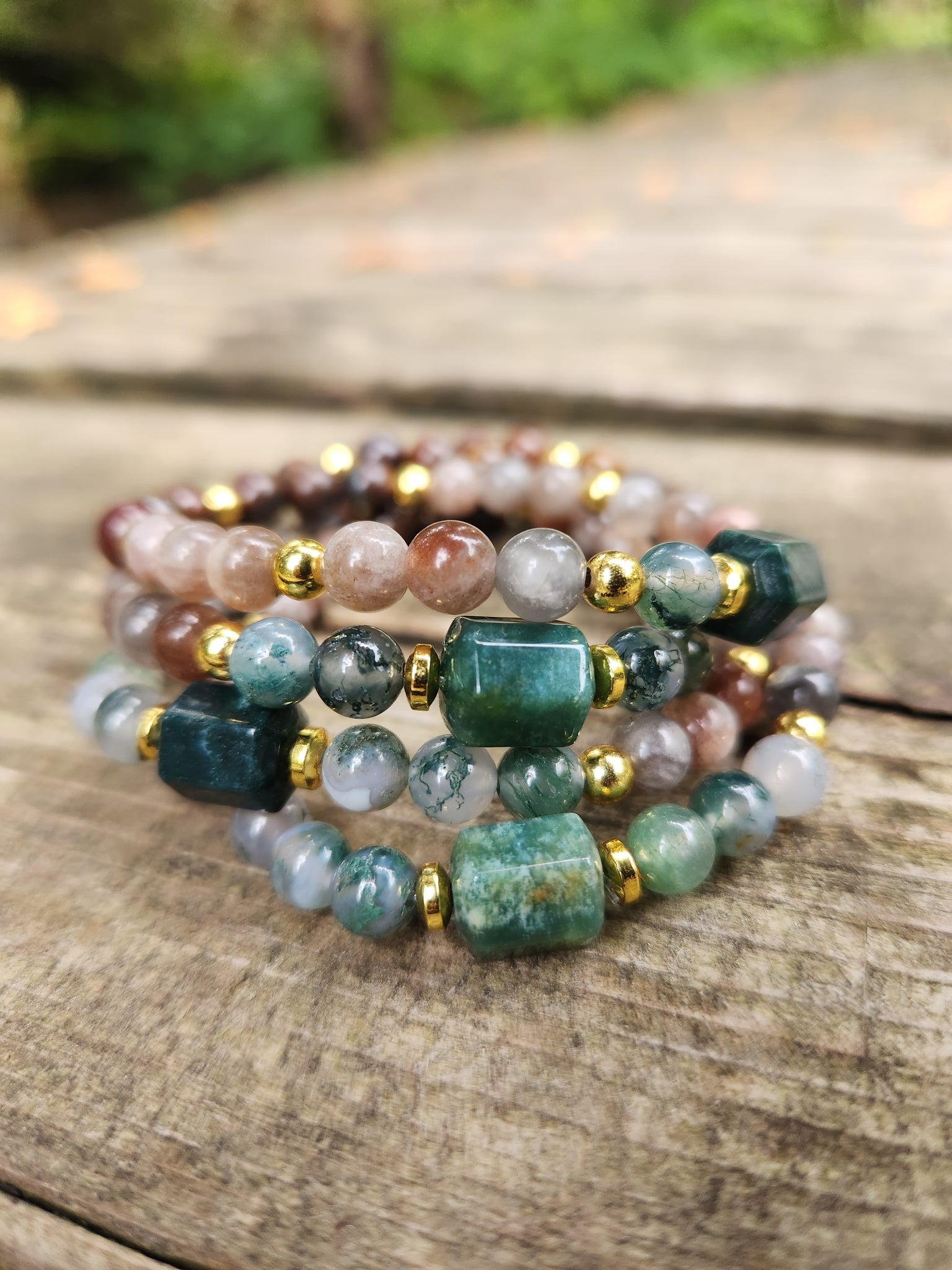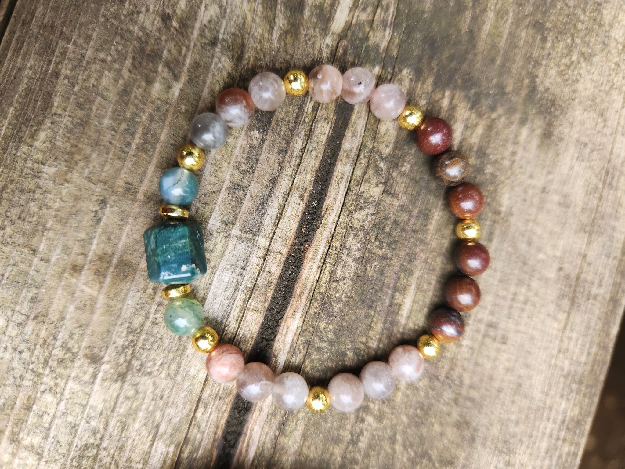 Made with moss agate, Sunstone, gold electroplated Hematite, and Tiger Iron.ย